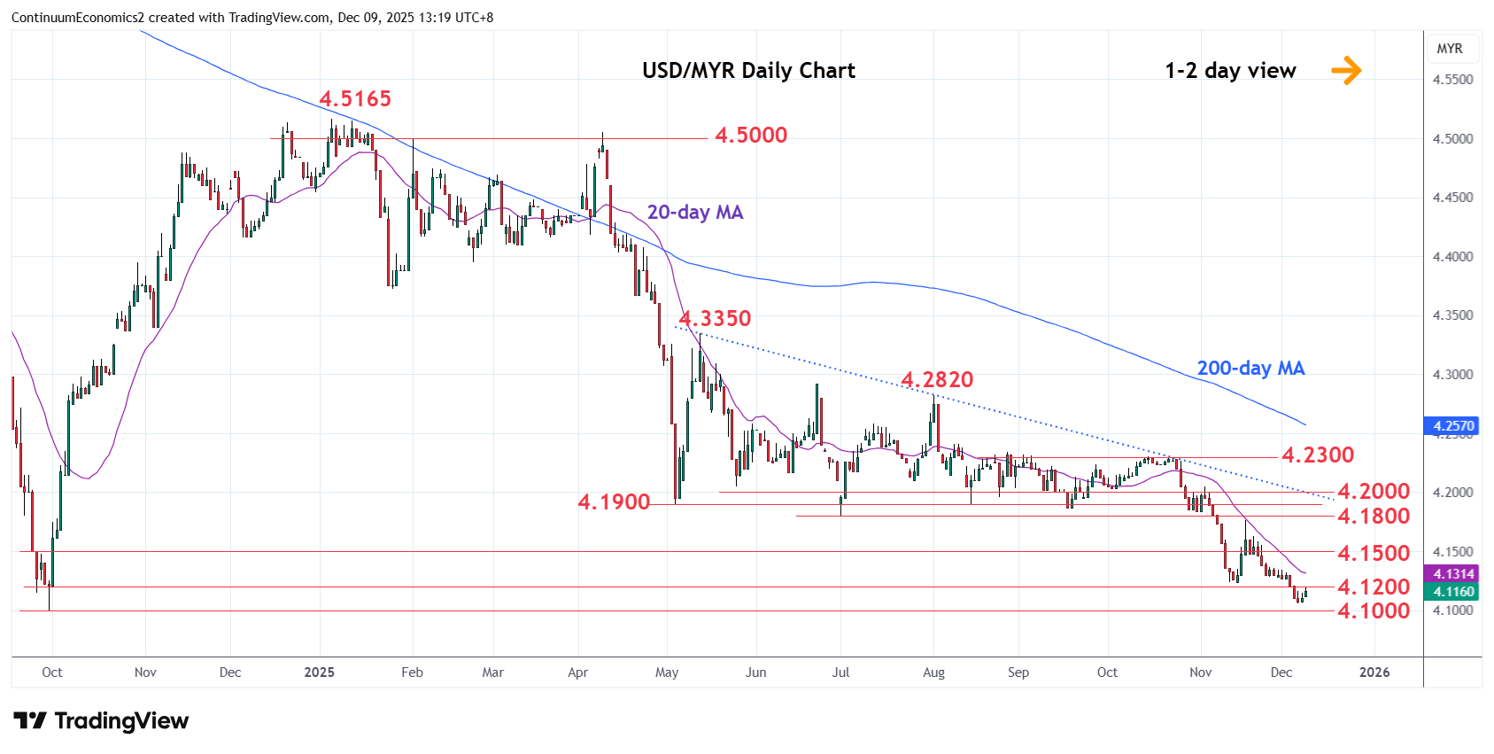 Edged up from the 4.1060 low to consolidate losses from the 4.1765, 18 November swing high