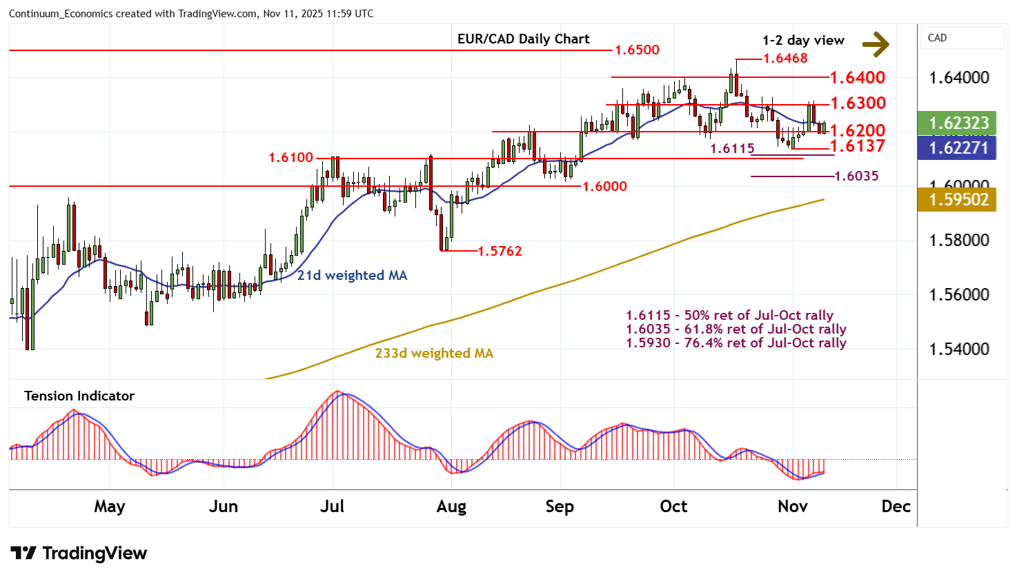 11:40 GMT - Consolidation around congestion support at 1.6200 has given way to a bounce, as oversold intraday studies, with prices currently trading around 1.6230. Daily readings are mixed/negative, however, suggesting increased selling interest towards congestion resistance at 1.6300 and room for further losses in the coming sessions. A break below 1.6200 will add weight to sentiment and open up strong support within 1.6100/15 - 1.6135~. However, flat oversold weekly stochastics could limit any initial tests in fresh consolidation. A close beneath here would add weight to sentiment and extend mid-October losses towards the 1.6035 Fibonacci retracement. Meanwhile, resistance remains at 1.6300 and should cap any immediate tests higher.