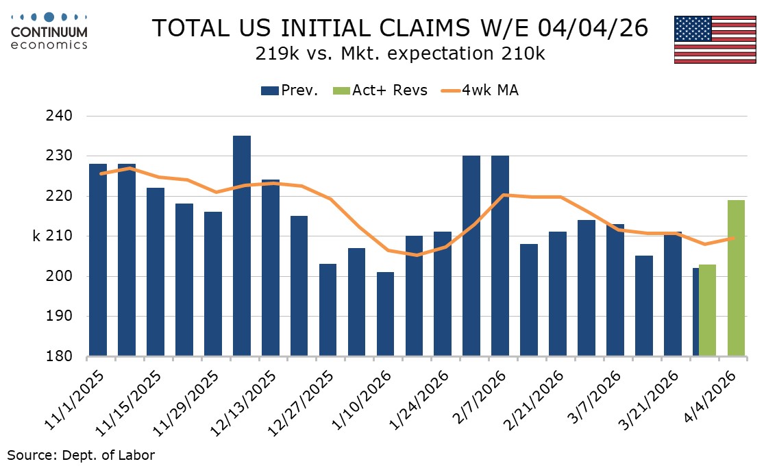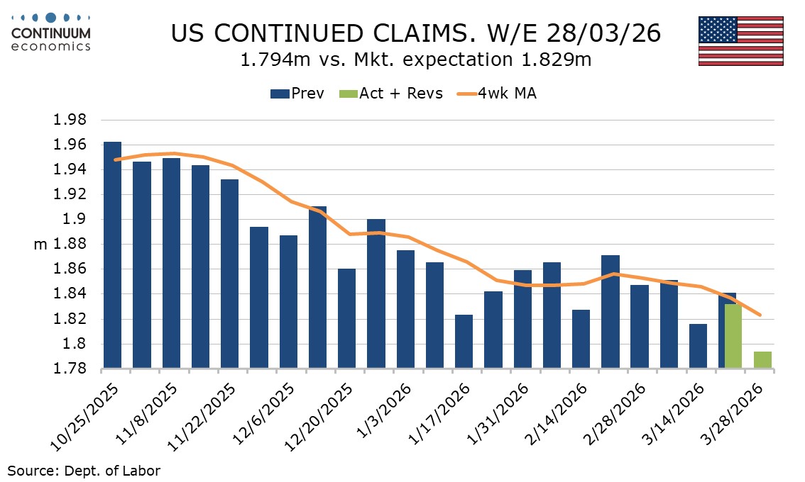 Continued claims cover the week before initial claims so the low continued claims number comes in a week when initial claims were low. At 1.794m from 1.832m the number is the lowest since May 2024 and a downtrend which appeared to have stalled in Q1 has resumed. This suggests jobs are becoming easier to find, supporting the message of March’s stronger non-farm payroll.