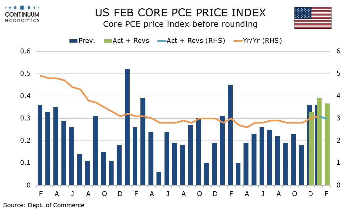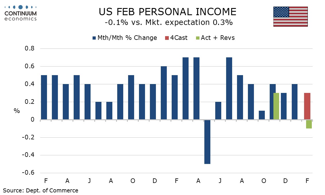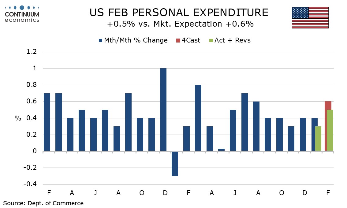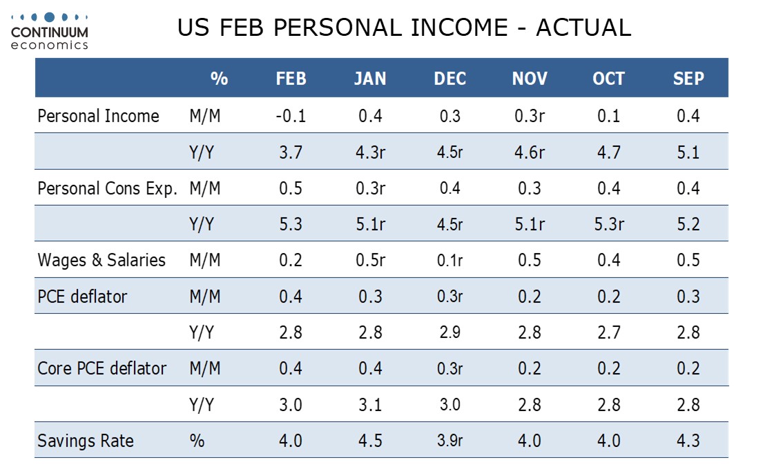 Personal spending was supported by strength in February retail sales already released, led by autos which rebounded from a weak January, but service spending rose by only 0.3%, weaker than expected and up only 0.1% in real terms. The savings ratio at 4.0% is back near Q4 levels after a bounce to 4.5% in January.