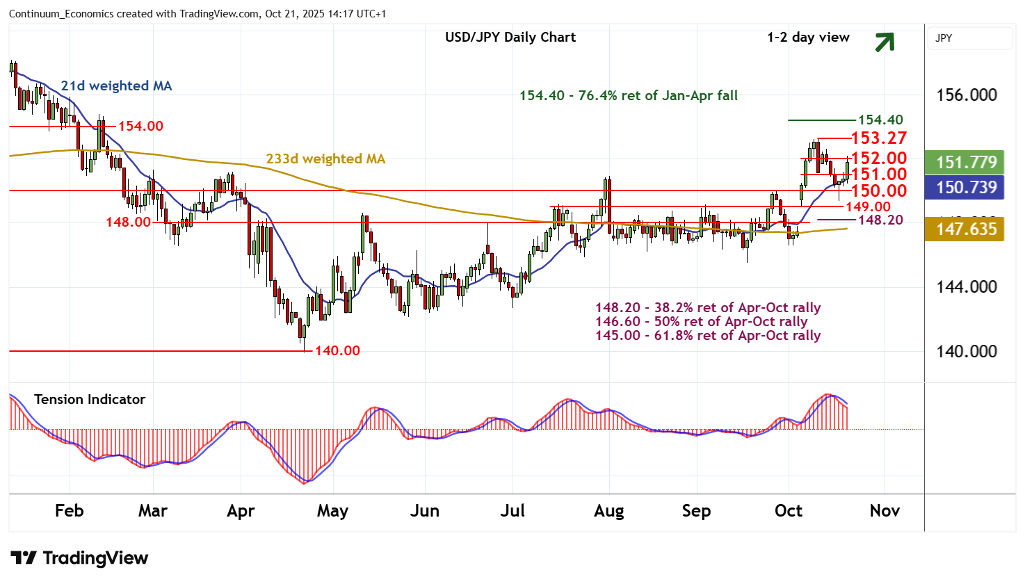 14:00 BST - Cautious trade has given way to a run higher in both USD- and JPY-driven trade, with prices currently consolidating the test of congestion resistance at 152.00. Daily readings are mixed, suggesting potential for consolidation beneath here, before improving weekly charts prompt a break and extend gains towards strong resistance at the 153.27 current year high of 10 October. A further close above here would turn sentiment positive and confirm continuation of April gains towards the 154.40 Fibonacci retracement. Meanwhile, support is raised to 151.00. A close beneath here, if seen, would help to stabilise price action and prompt consolidation above congestion around 150.00.
