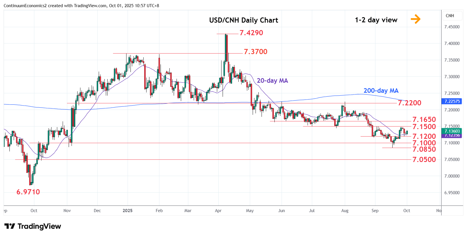 03:00 GMT - Extending consolidation within the 7.1500/7.1200 area as prices unwind the overbought daily studies. Positive weekly studies suggest this giving way to renewed buying interest later and break of the 7.1500 resistance will open up room for stronger gains to retrace the April/September losses to the 7.1650 resistance. Beyond this will see room for stronger gains to the 7.1900/7.2000 area. Meanwhile, support at 7.1200 now underpin and sustain bounce from the 7.0850, September current year low.
