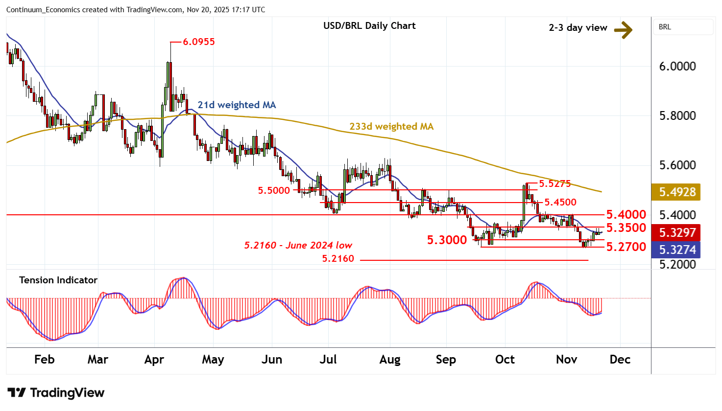 17:05 GMT - The anticipated break below critical support at the 5.2700 monthly low of 18 September has not been seen, as unwinding oversold daily stochastics prompt a bounce into consolidation beneath congestion resistance at 5.3500. The daily Tension Indicator is also rising, suggesting potential for a test above here. But negative weekly charts should limit scope in renewed selling interest beneath further congestion around 5.4000. Following cautious, lower levels are looked for. But a close below 5.2700 is needed to turn sentiment negative and confirm continuation of December 2024 losses, initially to the 5.2160 low of June 2024.