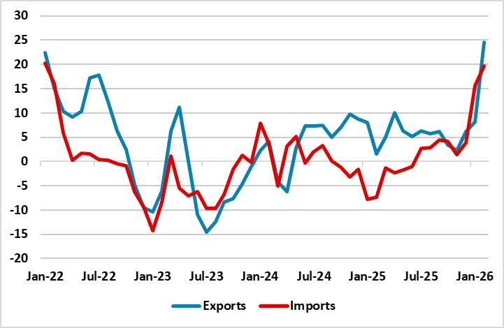 The main success of Trump’s visit will be on trade, where an extension of October trade truce is likely. China wants to avoid section 301 tariffs that could increase the current effective tariff of 25% and China officials have noted they keep all their option open (i.e. threatening to restrict rare earth mineral exports again). A trade deal remains unlikely, as China has been able to divert export to other countries and sustain total exports (Figure 2) – net exports should also remain a positive contribution to GDP growth in 2026.